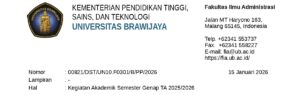Berikut disampaikan pengumuman terkait pelaksanaan Ujian Tengah Semester (UTS) Ganjil TA. 2025/2026 Fakultas Ilmu Administrasi Universitas Brawijaya. Mohon dapat diperhatikan dengan