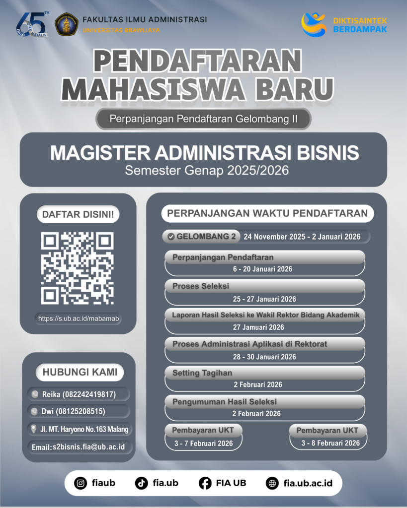 Ada kabar nih buat kamu yang ingin mendaftar Program Magister Administrasi Bisnis Semester Genap 2025/2026 dan sempet ketinggalan. Eittss! Jangan sedih karena Pendaftaran Gelombang II diperpanjang, jadi masih ada kesempatan untuk bergabung dan melanjutkan studi di Magister Administrasi Bisnis FIA UB🤩🙌🏻