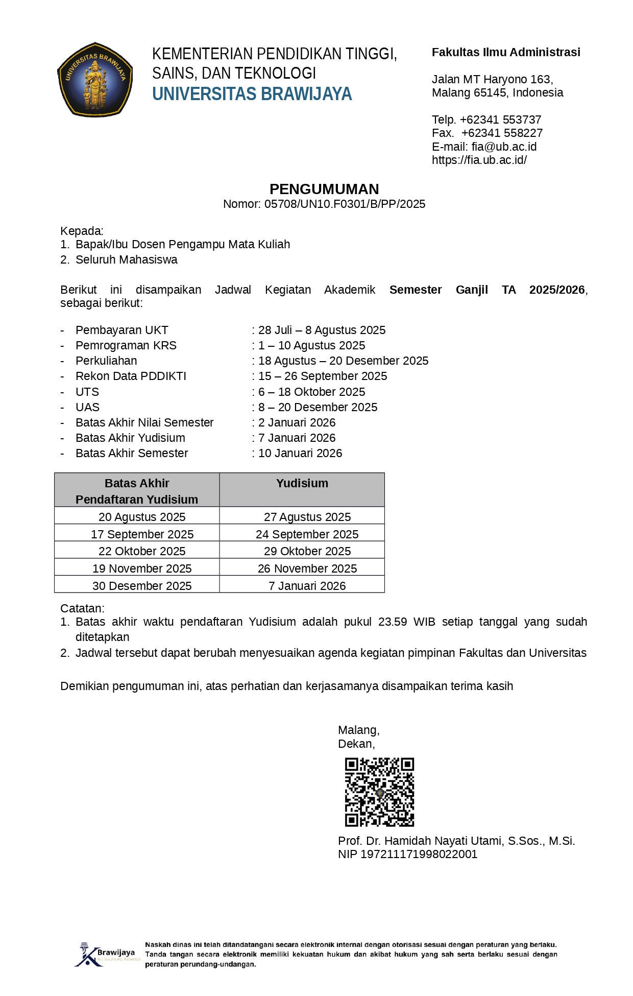 Berikut disampaikan terkait pengumuman Jadwal Kegiatan Akademik Semester Ganjil TA 2025/2026. Mohon untuk dapat diperhatikan dengan seksama.