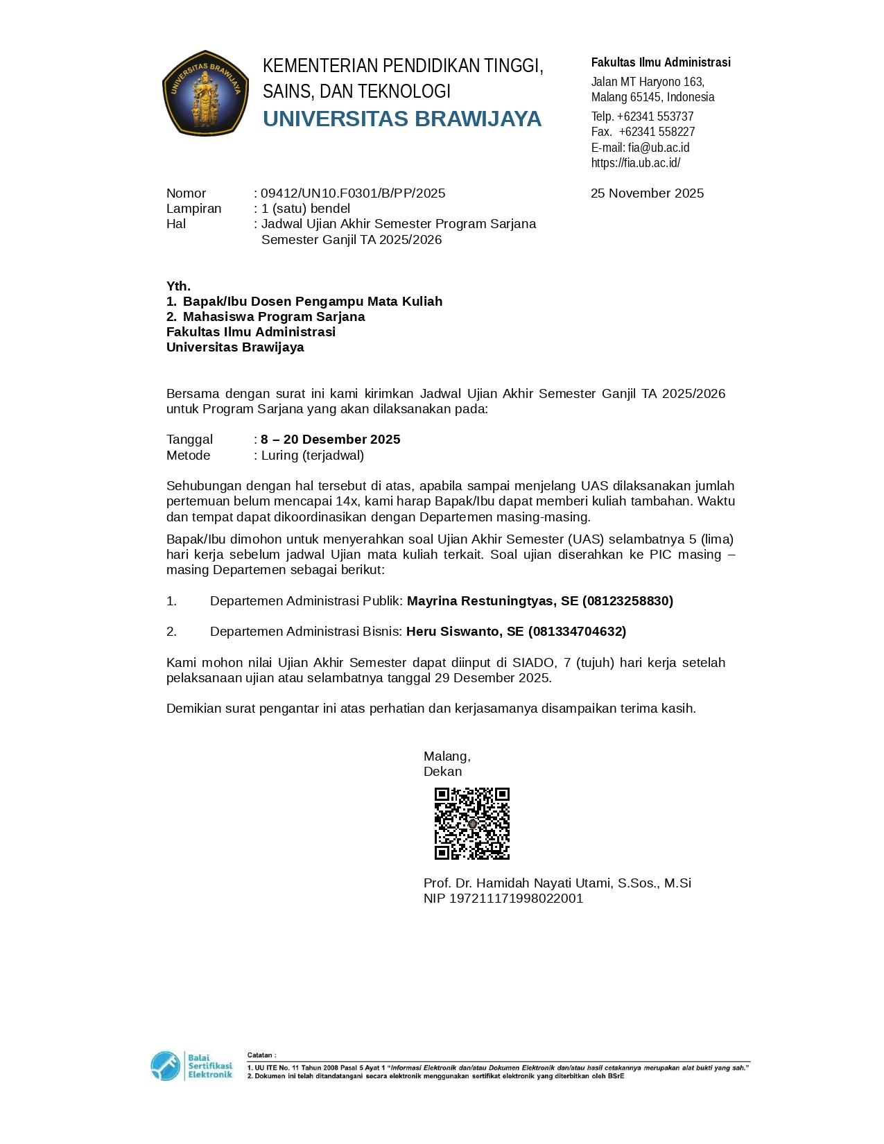 Berikut disampaikan Jadwal Ujian Akhir Semester (UAS) Ganjil Tahun Akademik 2025/2026 Program Sarjana Fakultas Ilmu Administrasi Universitas Brawijaya: