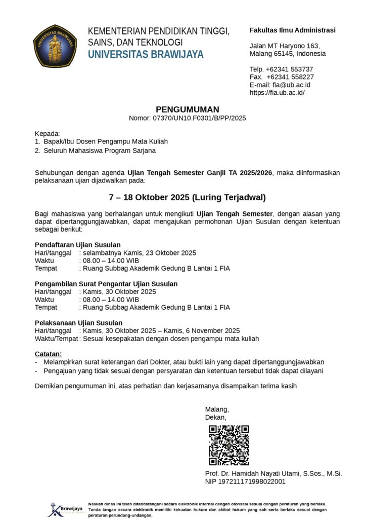 PENGUMUMAN : Pelaksanaan Ujian Tengah Semester (UTS) Ganjil TA. 2025/2026 Fakultas Ilmu Administrasi