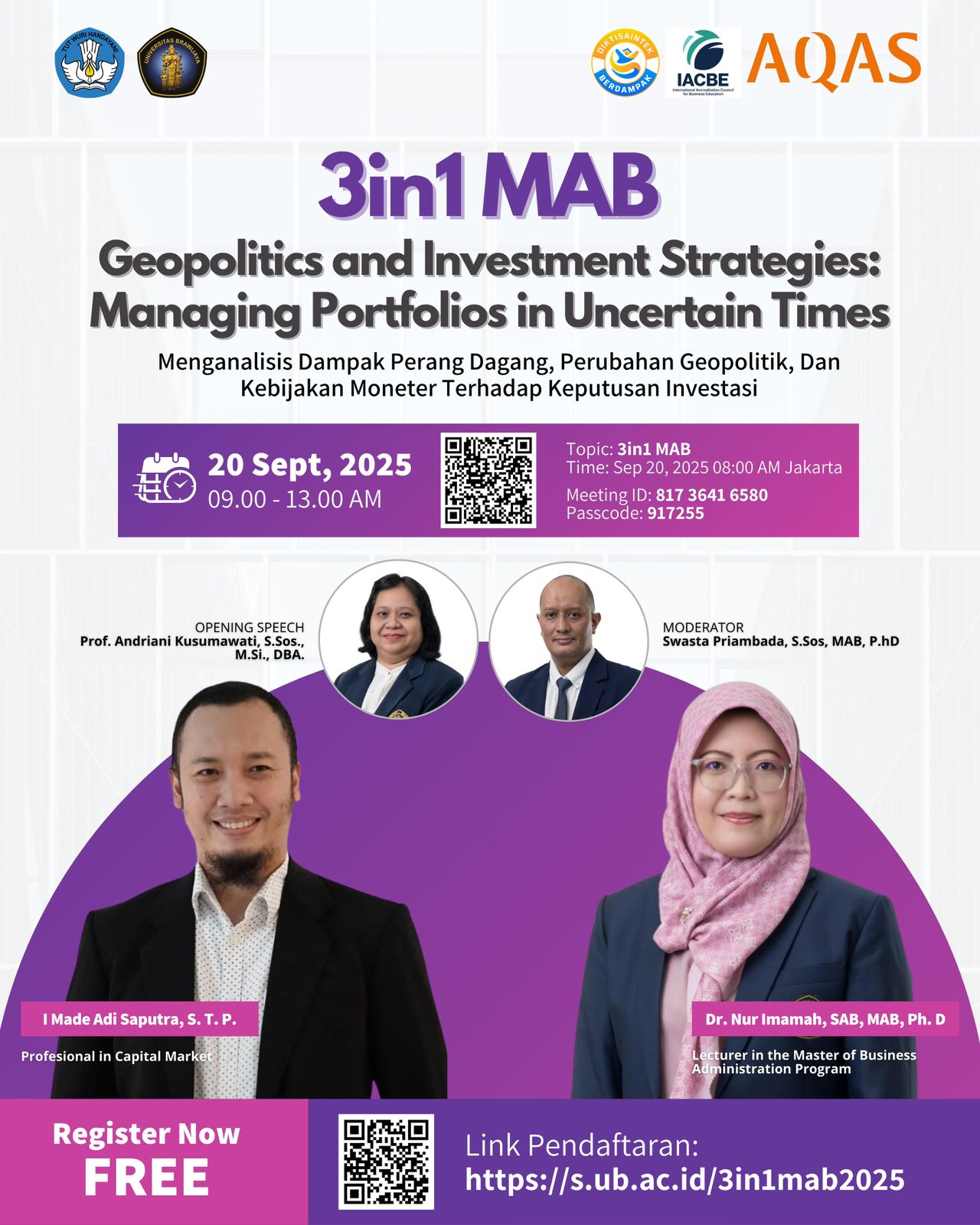 Gambar: Poster Kegiatan 3 in 1 MAB  3 in 1 MAB – Dunia investasi tidak pernah lepas dari dinamika global. Perang dagang, perubahan geopolitik, hingga kebijakan moneter internasional bisa menjadi faktor penting yang menentukan arah strategi investasi. Ingin tahu bagaimana cara cerdas mengelola portofolio di tengah ketidakpastian tersebut? Yuk ikuti 3in1 yang diadakan oleh FIA … Baca Selengkapnya