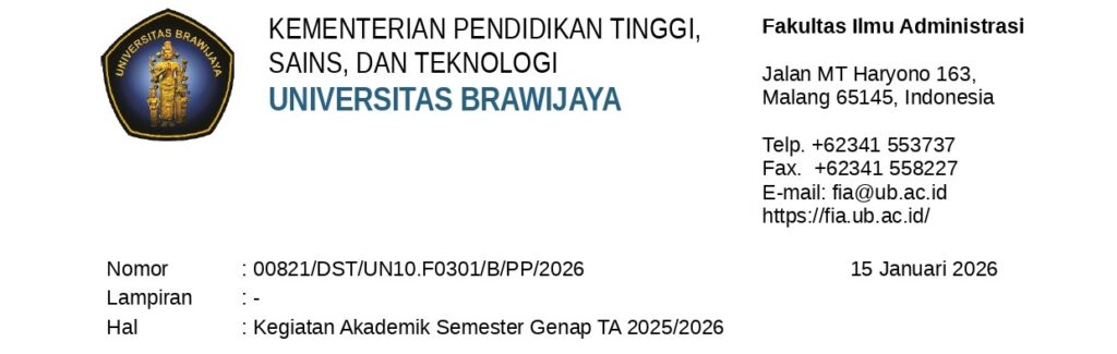 Directorate of Administration and Academic Services | Rectorate Building 2nd Floor | Jl. Veteran Malang 65145 | Tel. 0341-575 754 , 0341-551 611 (117/118) | WA: 0821-3142-4040 | Email: akademik.center@ub.ac.id
